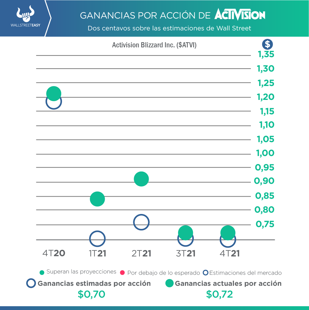 - Si bien Activision Blizzard mostró números sólidos, su perspectiva del cuarto trimestre no cumplió con las expectativas. La compañía espera ingresos de $2.780M, mientras que los analistas estiman $2.950M. Las ganancias por acción esperadas para el 4T21 también fueron más bajas que las esperadas, la compañía proyecta $1,29, más bajo que lo esperado por el mercado, $1,39.