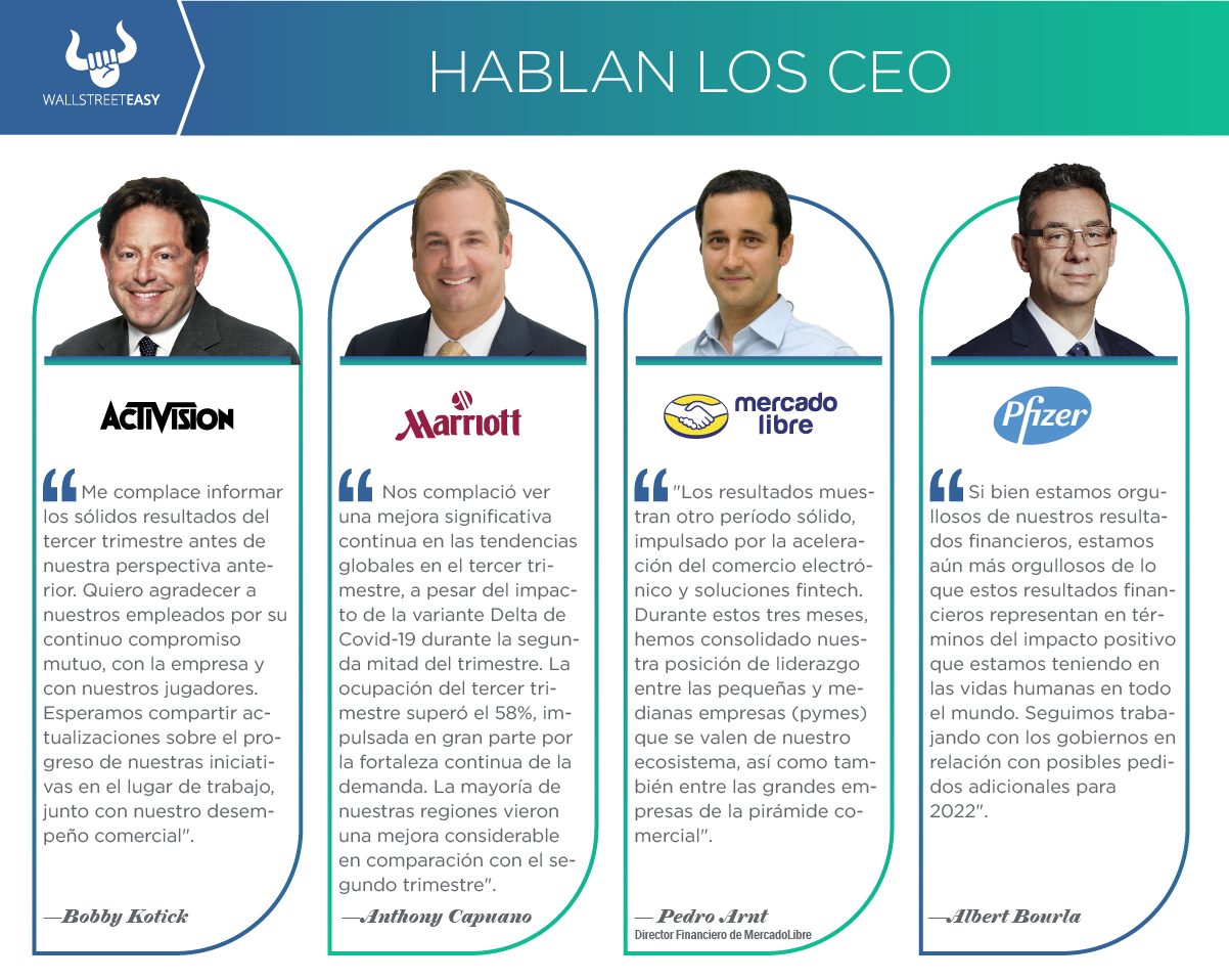 Una nueva semana de reportes del tercer trimestre de 2021. A continuación, veremos cómo les fue a Activision Blizzard Inc. (ATVI); Marriott International Inc. (MAR); MercadoLibre Inc. (MELI); Moderna Inc. (MRNA); Pfizer Inc. (PFE) y Zoetis Inc. (ZTS).