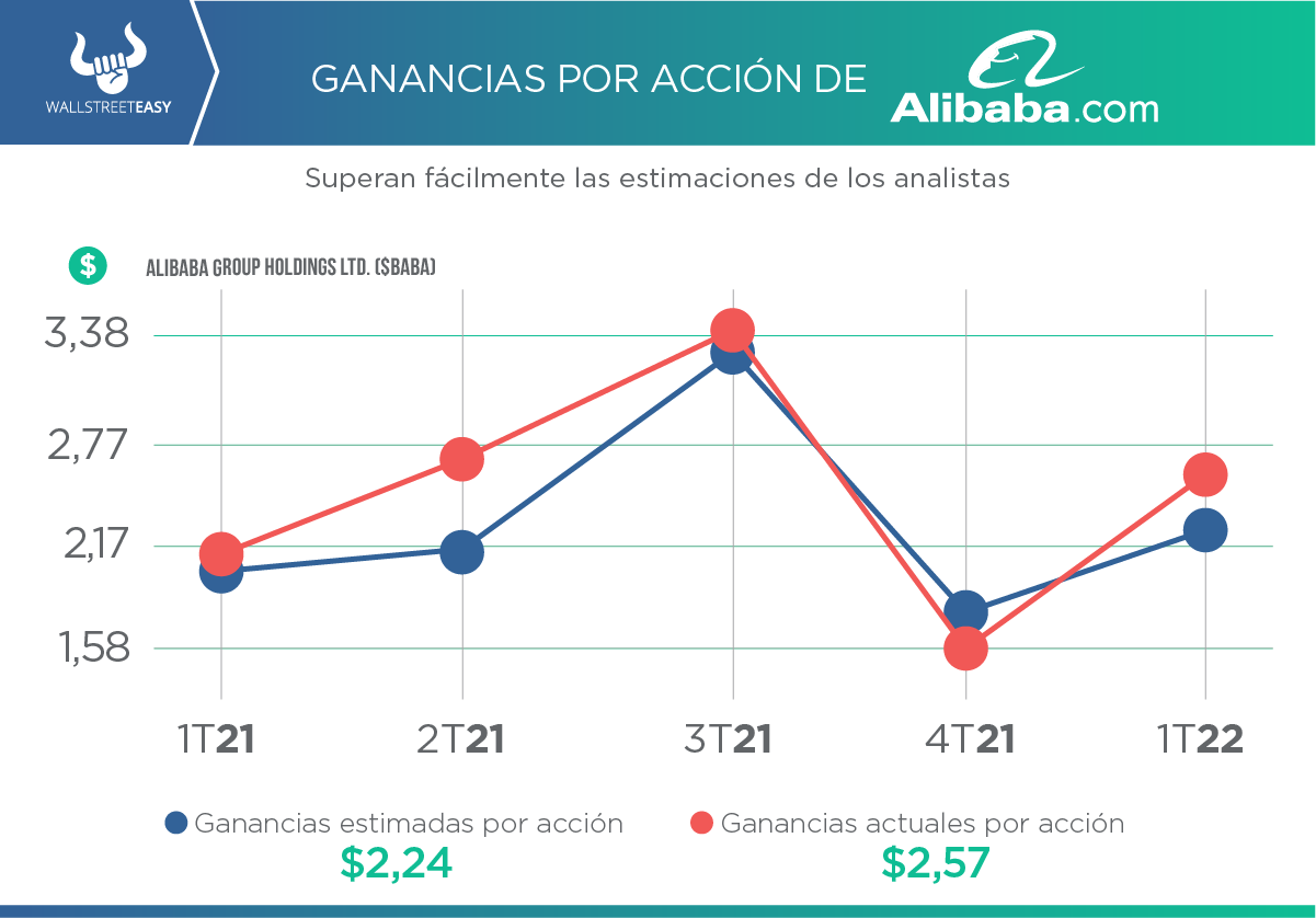 - Las ganancias de $2,57 por acción superaron la estimación de $2,24, y aumentaron +12% con respecto a las ganancias del año anterior. Los ingresos subieron +34% a $31.900M, pero no alcanzaron la marca de $32.640M. La falla se debe a la creciente competencia de minoristas más pequeños como JD.Com y Pinduoduo.