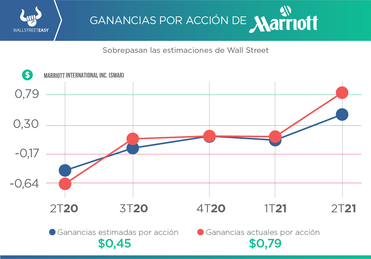 - Impulsadas por la fuerte demanda de viajes de placer, las ganancias del segundo trimestre de Marriott International se recuperaron drásticamente con respecto al año anterior, cuando la pandemia afectó mucho a las acciones de los hoteles. Aún así, las acciones cayeron –3,5% en las operaciones recientes.