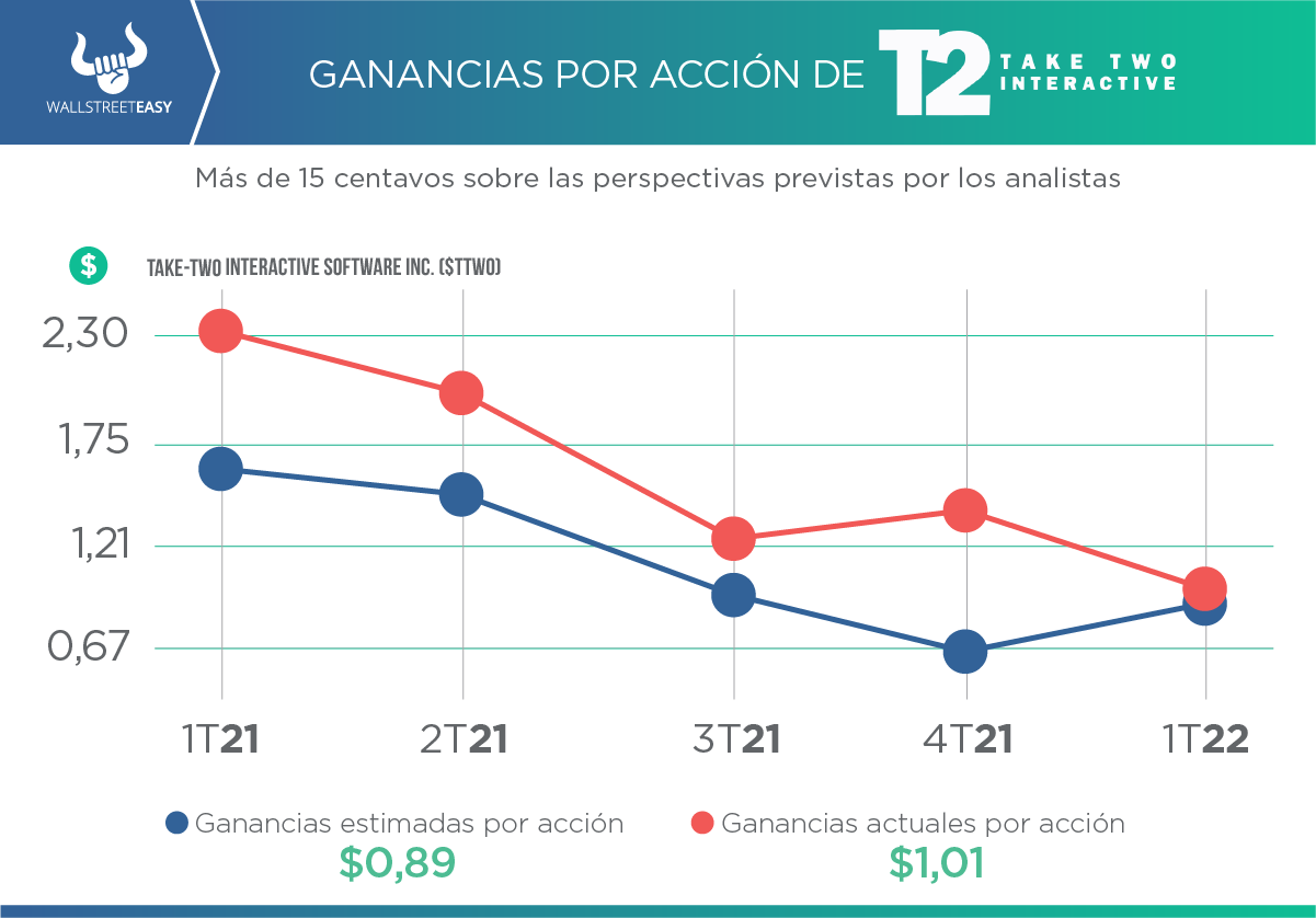 - Take-Two pronosticó ganancias fiscales para el trimestre actual de 35 a 45 centavos por acción, con ingresos de $740M a $790M; y de $1,95 a $2,20 por acción sobre ingresos de $3.140M a $3.240M para el año. Los analistas habían estimado 47 centavos por acción sobre ingresos de $788,6M para el trimestre, y $2,87 por acción e ingresos de $3.300M para el año.