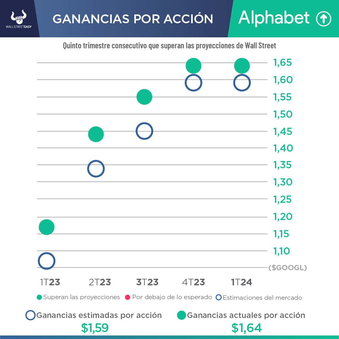 - En el trimestre de diciembre, la matriz de Google registró ingresos de $86.300M, +13% más que hace un año y por encima de la previsión de $85.300M del consenso de Wall Street. El beneficio por acción fue de $1,64, superando la proyección de $1,59 por acción.