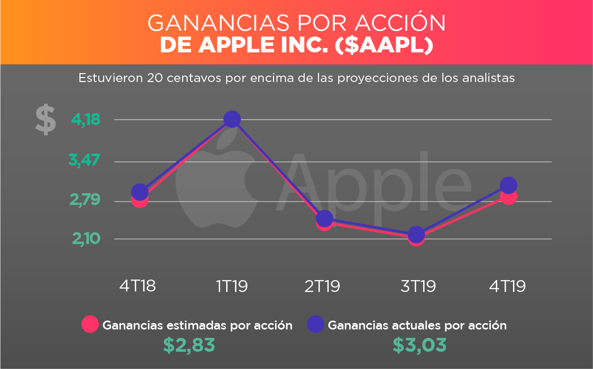 - «Concluimos un innovador año fiscal 2019 con nuestros ingresos más altos del trimestre, impulsados por el crecimiento acelerado de servicios, wearables y iPad. Con los clientes y críticos entusiasmados con la nueva generación de iPhones, el debut del nuevo AirPod Pro, la llegada muy esperada de Apple TV+, estamos muy optimistas sobre lo que tenemos para este trimestre de vacaciones», comentó Tim Cook, CEO de Apple.