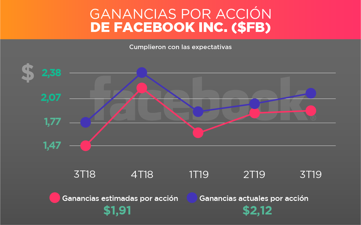 - Facebook informó un crecimiento de los ingresos del 29% respecto al año anterior, marcando el tercer trimestre consecutivo de expansión por debajo del 30%. La competencia en el mercado de anuncios en línea ha aumentado, en particular con Amazon convirtiéndose en un jugador más grande, pero la red social está encontrando más vías para el crecimiento de anuncios en Instagram, y a través de nuevos formatos como Historias.