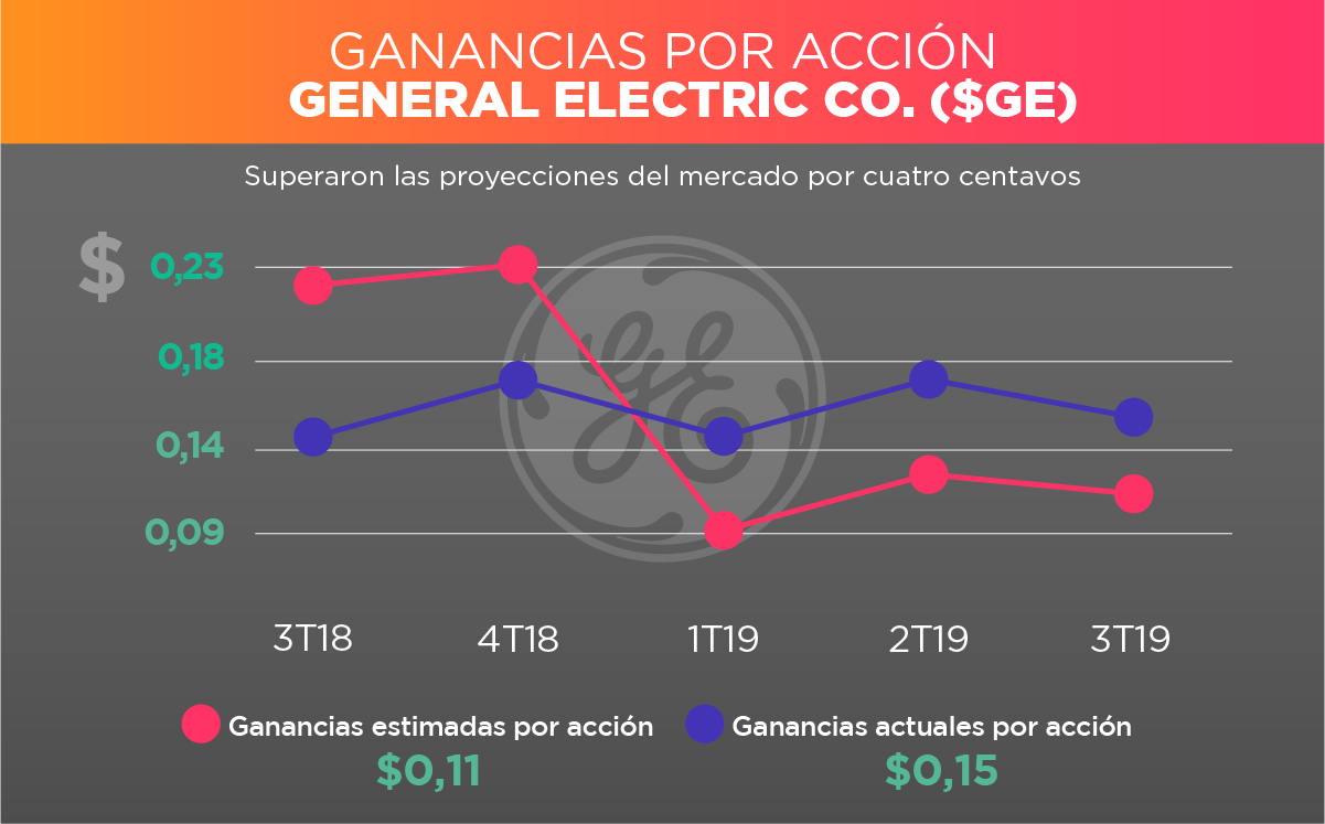 - GE registró ganancias ajustadas en el tercer trimestre de $1.280M, o 15 centavos por acción, frente a $980M, u 11 centavos por acción, en el mismo período del año anterior. Los analistas esperaban ganancias de 12 centavos. Los ingresos llegaron a $23.360M frente a $23.390M hace un año.