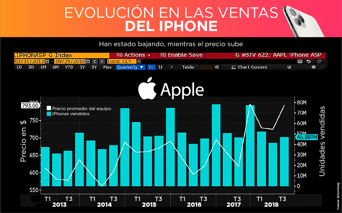 - Los ingresos de $64.000 mil millones aumentaron +2% año tras año en comparación con el mismo trimestre de 2018, con ganancias trimestrales por acción de $3,03, +4% más que en 2018. Pero las ventas de iPhone, que siguen siendo el mayor generador de dinero de Apple, continuaron disminuyendo en comparación con el año pasado, generando $33.360M en ingresos, en comparación con $36.760M el año pasado, una caída de 9,2%.