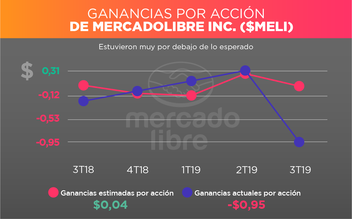 - MercadoLibre informó el pasado jueves una pérdida de $146,1M en su tercer trimestre. Sobre una base por acción, la compañía con sede en Buenos Aires, Argentina, dijo que tuvo una pérdida de $2,96. Las pérdidas, ajustadas por gastos antes de impuestos, llegaron a 97 centavos por acción. La estimación promedio era para ganancias de un centavo por acción.