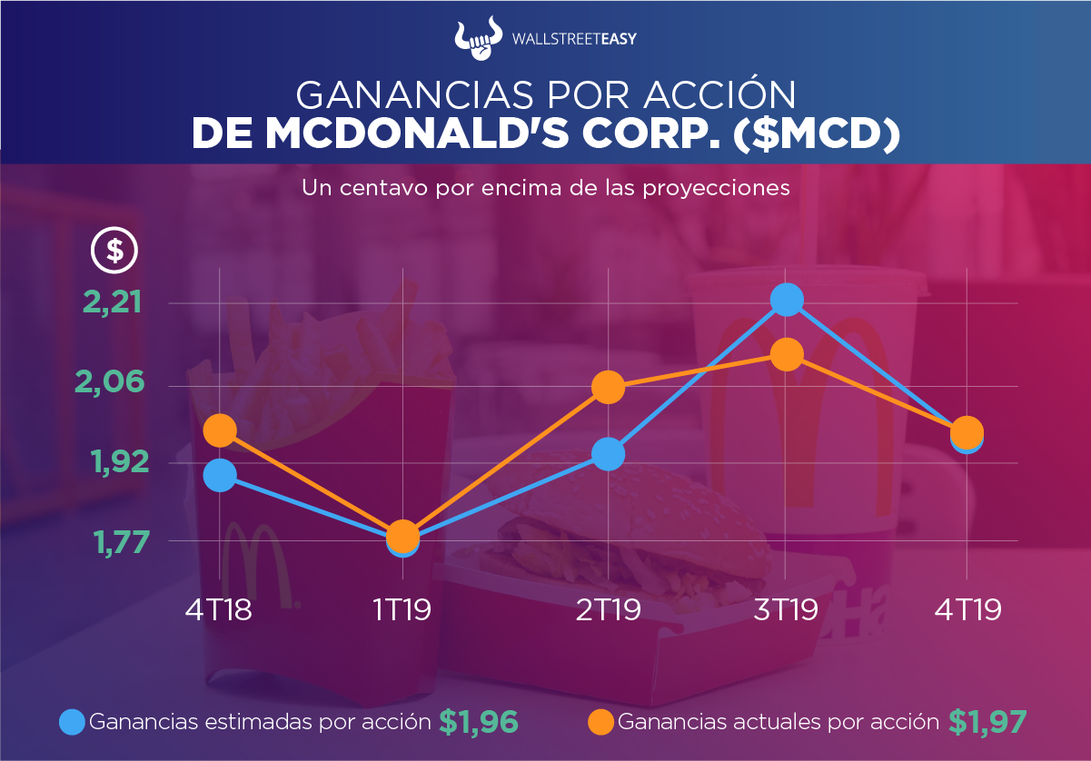 • En EEUU, las ventas en la misma tienda subieron +5,1% durante el trimestre, a pesar de que el tráfico en los restaurantes disminuyó 1,9% en 2019. La empresa atribuyó el crecimiento de las ventas en EEUU a aumentos de precios, fuertes ventas de artículos básicos del menú, como Big Mac, y los impactos positivos de las renovaciones de tiendas de alta tecnología que incluyen quioscos de autoservicio.