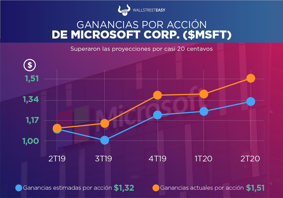 • Las ganancias de $1,51 por acción, superaron las perspectivas de $1,32. Los ingresos de $36.910M, sobrepasaron los $35.680M esperados por los analistas. Año tras año, los ingresos de Microsoft aumentaron +14% en el trimestre, y +63% en el último año.