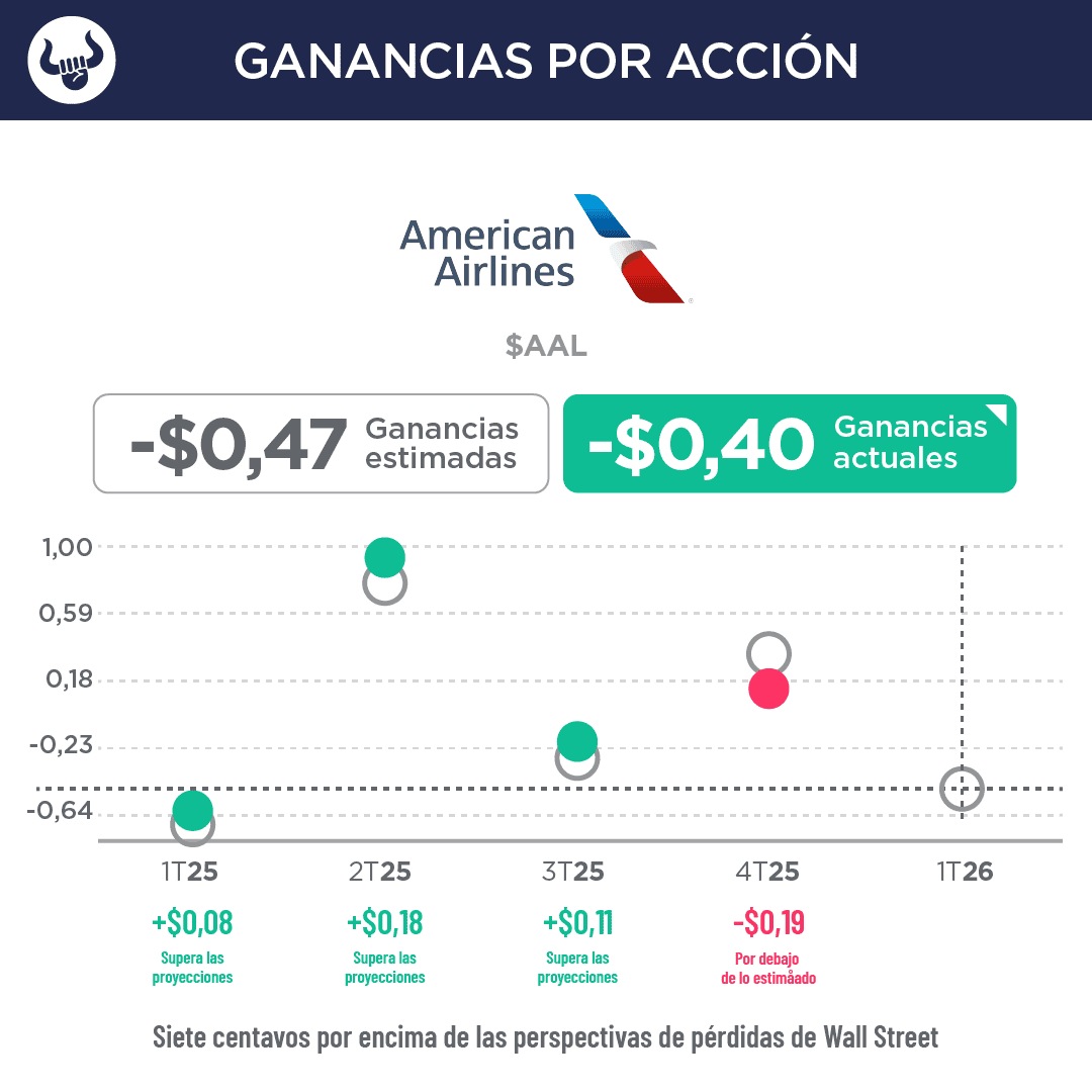 - La aerolínea registró una pérdida neta de $382M, o 58 centavos por acción, en comparación con la pérdida neta de $473M, o 72 centavos, un año antes. Ajustando elementos extraordinarios, la compañía informó una pérdida de 40 centavos por acción (pérdida esperada 47 centavos). Sus ingresos de $13.910M aumentaron 10,8% con respecto a los ingresos de $12.550M del año anterior ($13.790M estimados).