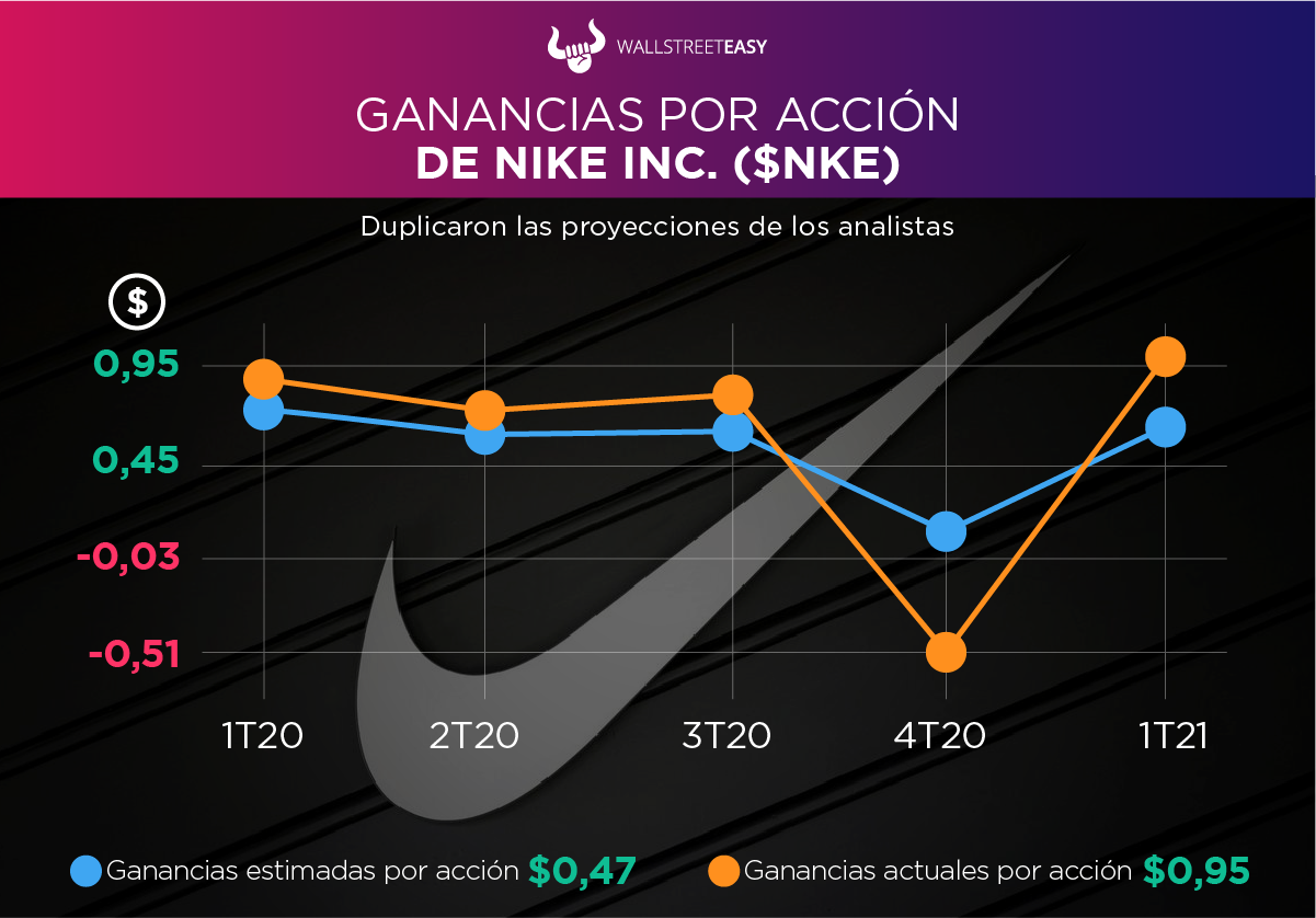 - Las ganancias por acción del mayor fabricante de zapatos deportivos de EEUU fueron de 95 centavos por acción frente a los 47 centavos esperados, y los ingresos de $10.590M estuvieron por encima de los $9.150M estimados.