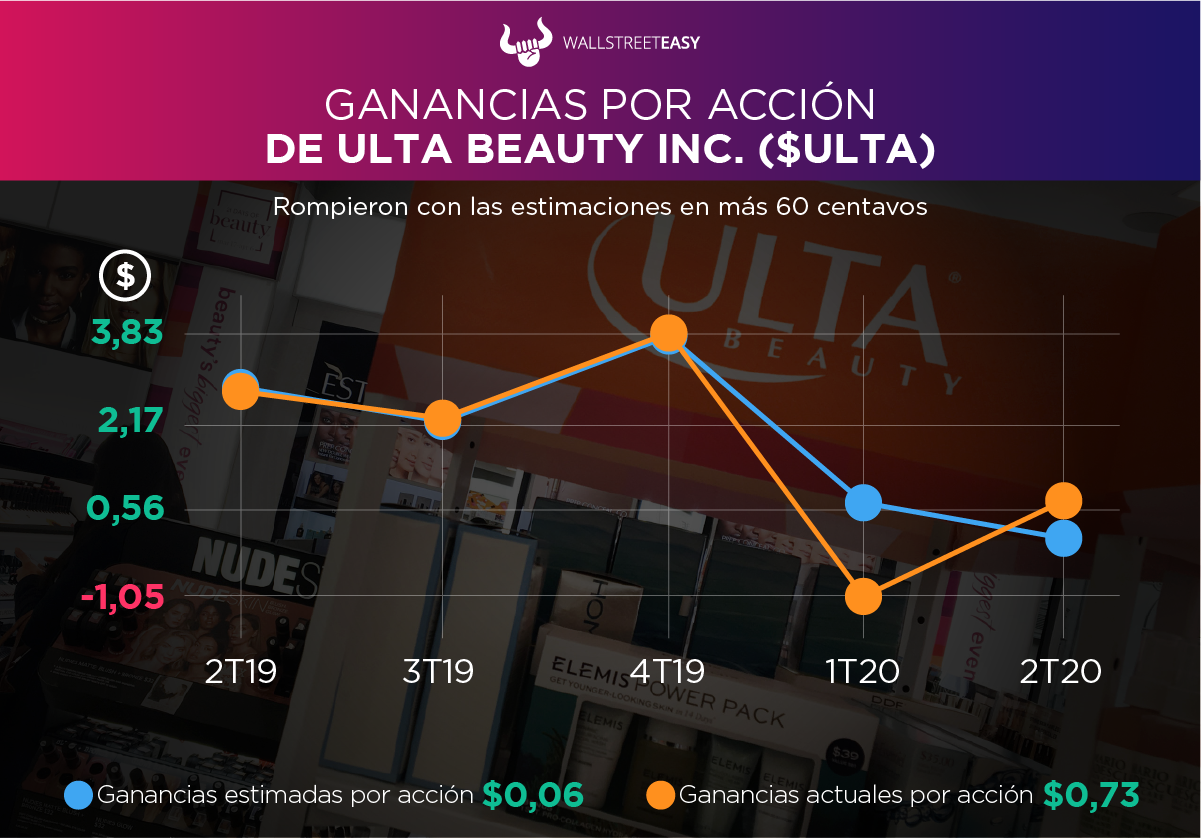 - Ulta dijo que las ventas de comercio electrónico se dispararon más del +200%. Además, que las ventas comparables se recuperaron bien durante todo el trimestre, desde +37% en mayo hasta +10% en julio, a medida que las tiendas volvieron a abrir, y continúan con una tendencia al alza, solo en el rango medio de un dígito por primera vez.