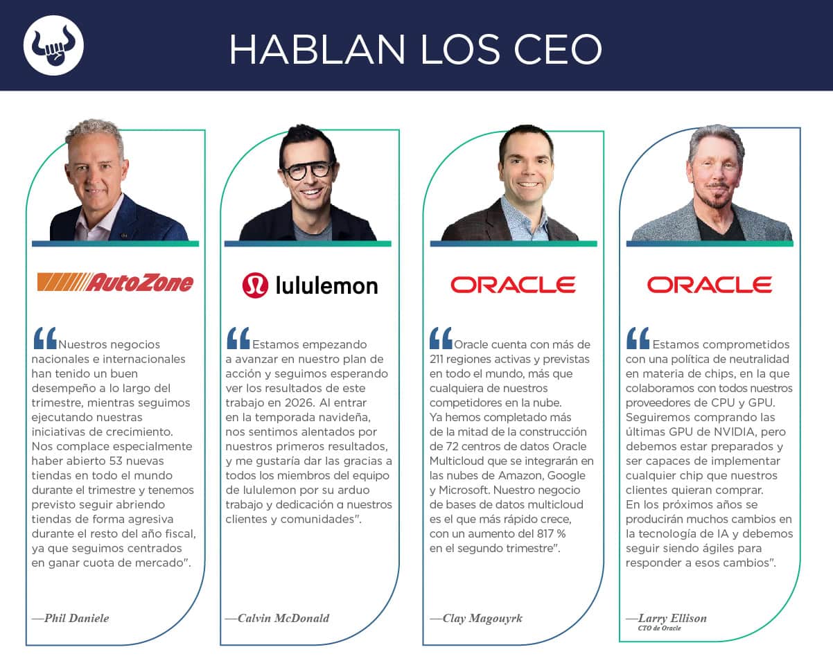 De las cuatro empresas que observamos para el reporte, AutoZone no alcanzó las previsiones de Wall Street, a pesar de haber visto un aumento en las ventas año tras año. Por su parte, Oracle cumplió con las expectativas y mostró un importante repunte en las contrataciones, mientras que Lululemon anunció una nueva recompra de acciones. Nos mantenemos atentos para traerles los mejores trades.