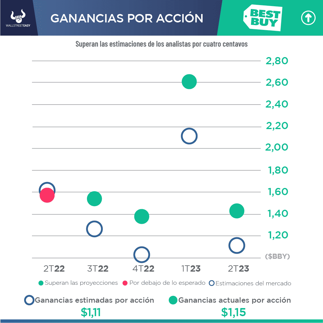 - Los beneficios por acción del minorista de electrónica de consumo fueron de $1,15 ajustados frente a los $1,11 esperados, e ingresos de $9.470M, que no alcanzaron las previsiones de $9.520M.