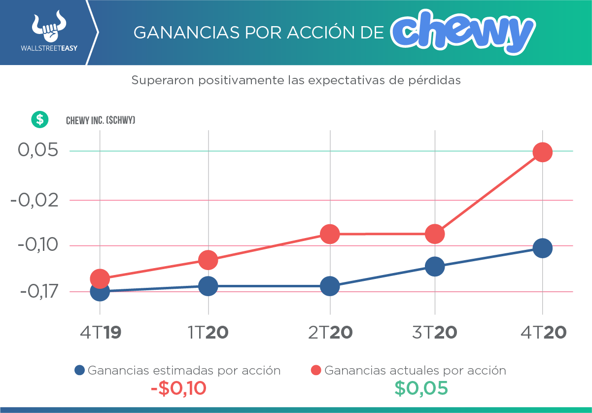 Chewy informó resultados que superaron las estimaciones, y ganancias ajustadas por primera vez, frente a expectativas de pérdidas: