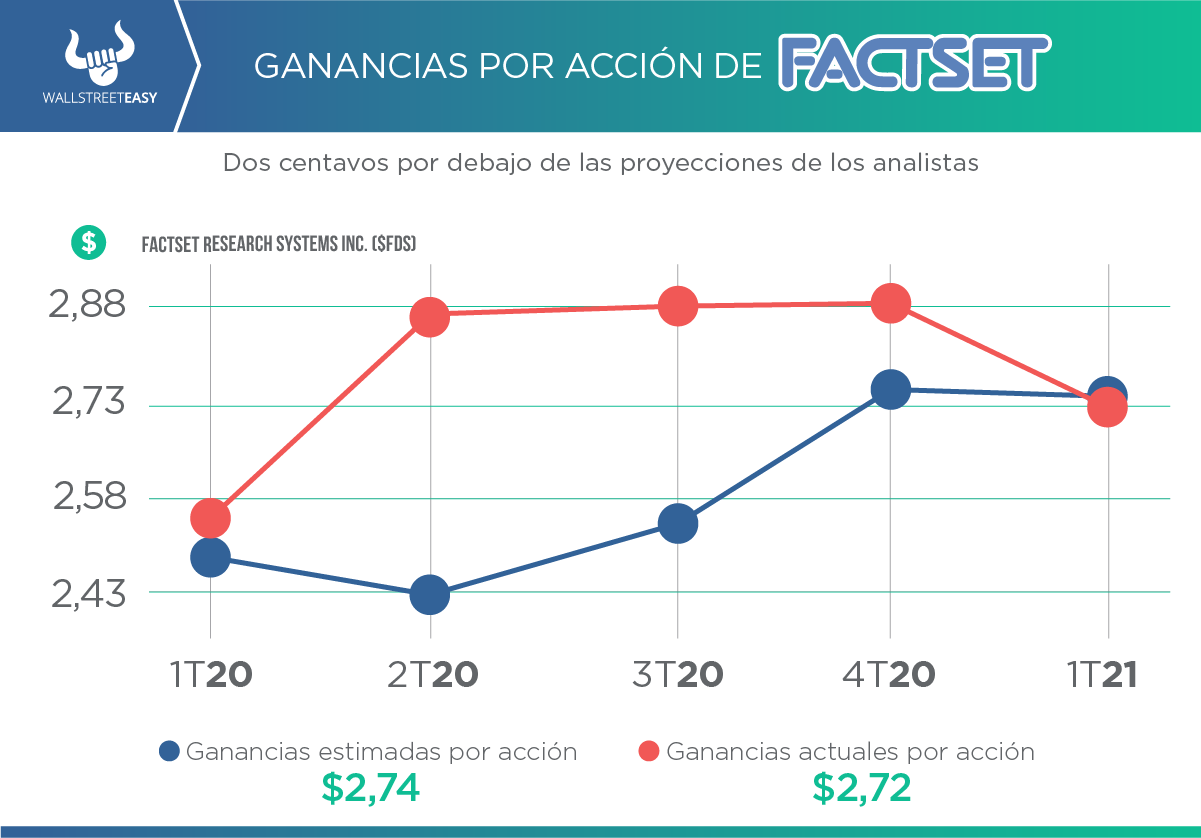 - En cuanto al año fiscal 2021, FactSet anticipó ganancias ajustadas en el rango de $10,75 a $11,15 por acción, por debajo de las estimaciones de $11,17 por acción. La compañía pronosticó ingresos para 2021 de $1.570 a $1.585M, mientras que los analistas anticipaban ingresos de $1.580M.