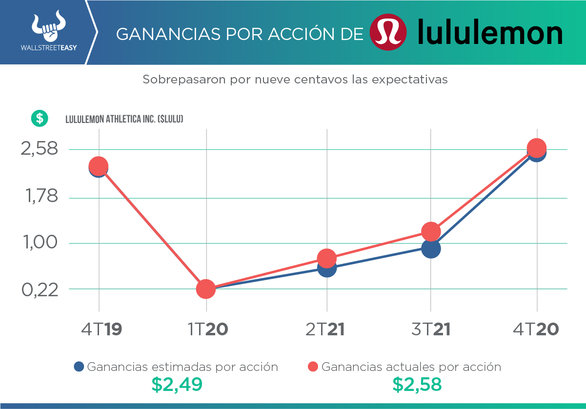 - Para el primer trimestre de 2021, Lululemon espera que los ingresos netos estén en el rango de $1.100M a $1.130M y ganancias ajustadas por acción entre 86 y 90 centavos. Para todo el año 2021, estiman ingresos netos en el rango de $5.550M a $5.650M, y ganancias por acción de $6,30 a $6,45.
