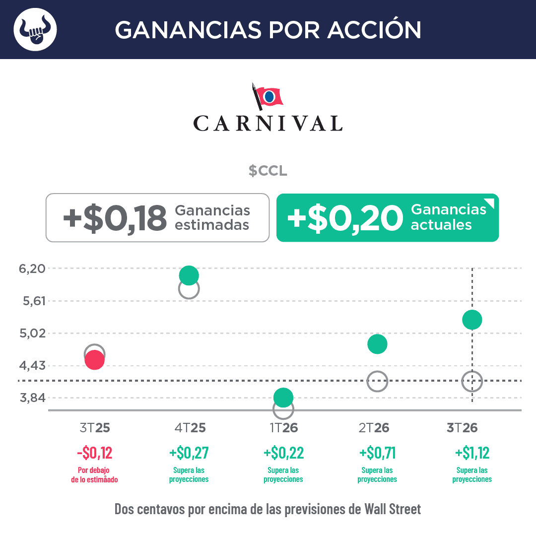 • La empresa de cruceros anunció ganancias trimestrales de $0,2 por acción, superando la estimación de $0,18 por acción, e ingresos de $6.170M, por encima de la previsión en 0,97%, y los $5.810M del año anterior.