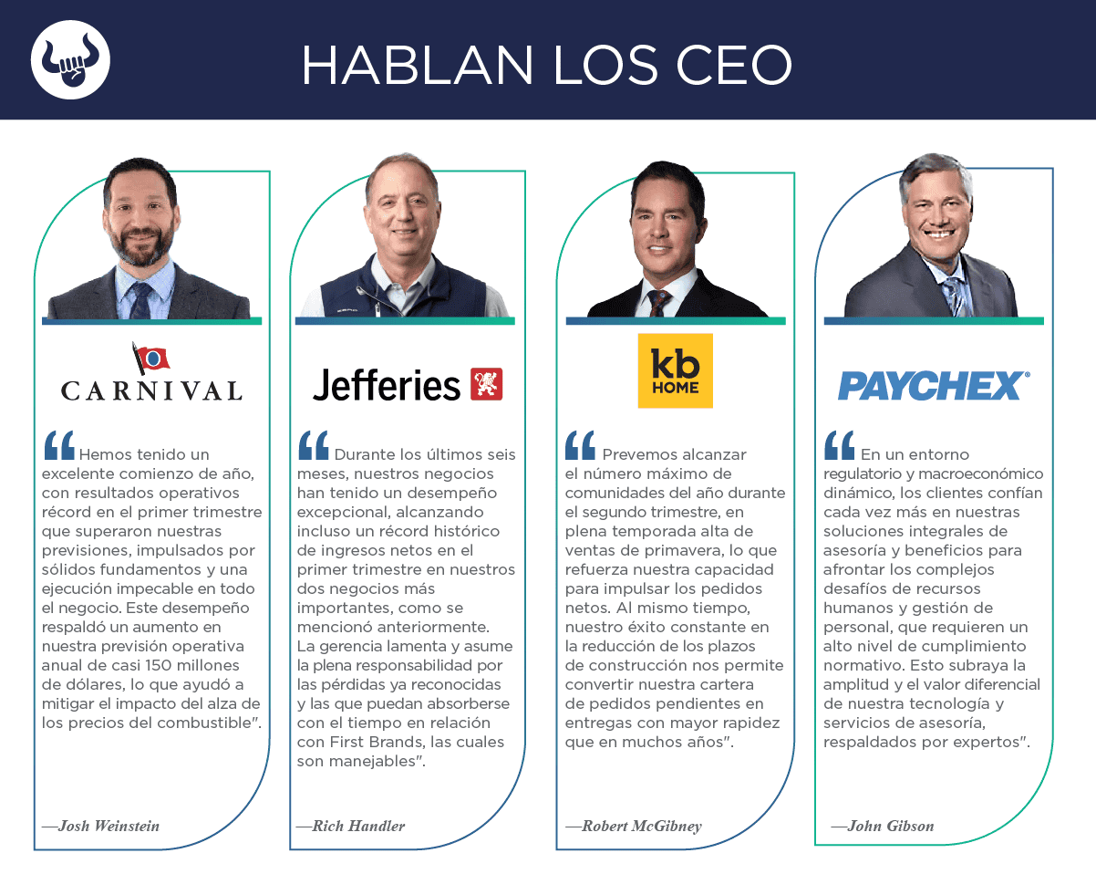 LA NOTICIA En una nueva semana de reportes de ganancias del cuarto trimestre de 2025, veremos cómo les fue a Carnival Corp. ($CCL), GameStop Corp. ($GME), Jefferies Financial Group Inc. ($JEF), Kb Home ($KBH) y Paychex Inc. ($PAYX). PONME AL DÍA Carnival supera las estimaciones de ganancias e ingresos del trimestre: