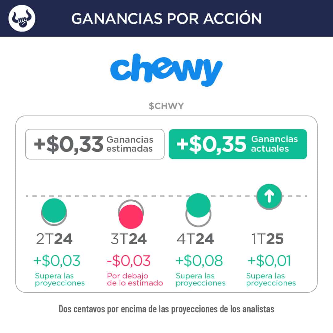- La empresa de comercio electrónico centrada en mascotas reportó 35 centavos por acción ajustados, 13% más que el año anterior, y superó los 33 centavos por acción que pronosticaban los analistas.
