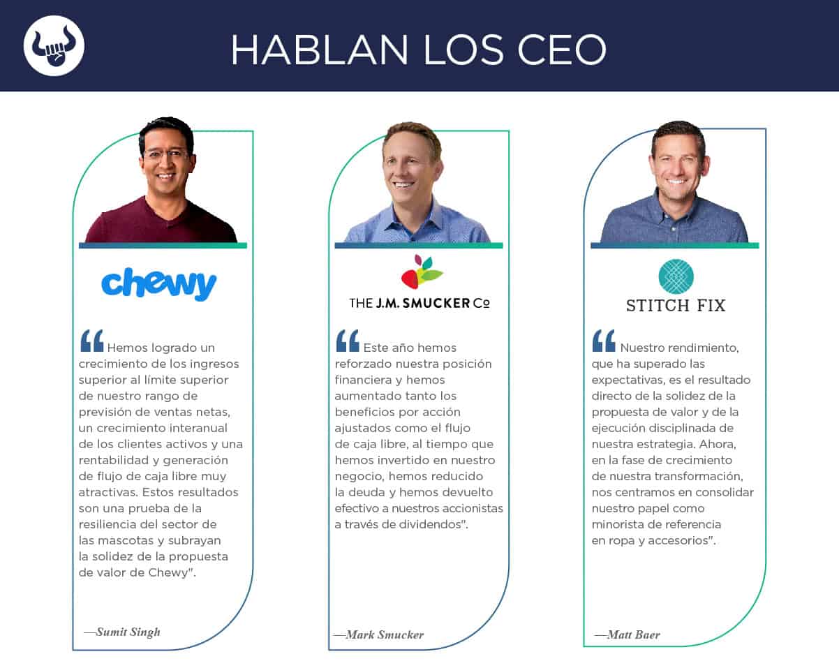 - Las ventas aumentaron 8% interanual hasta alcanzar los $3.120M, superando las estimaciones de $3.080M. Chewy aumentó sus ventas 15% en el trimestre.