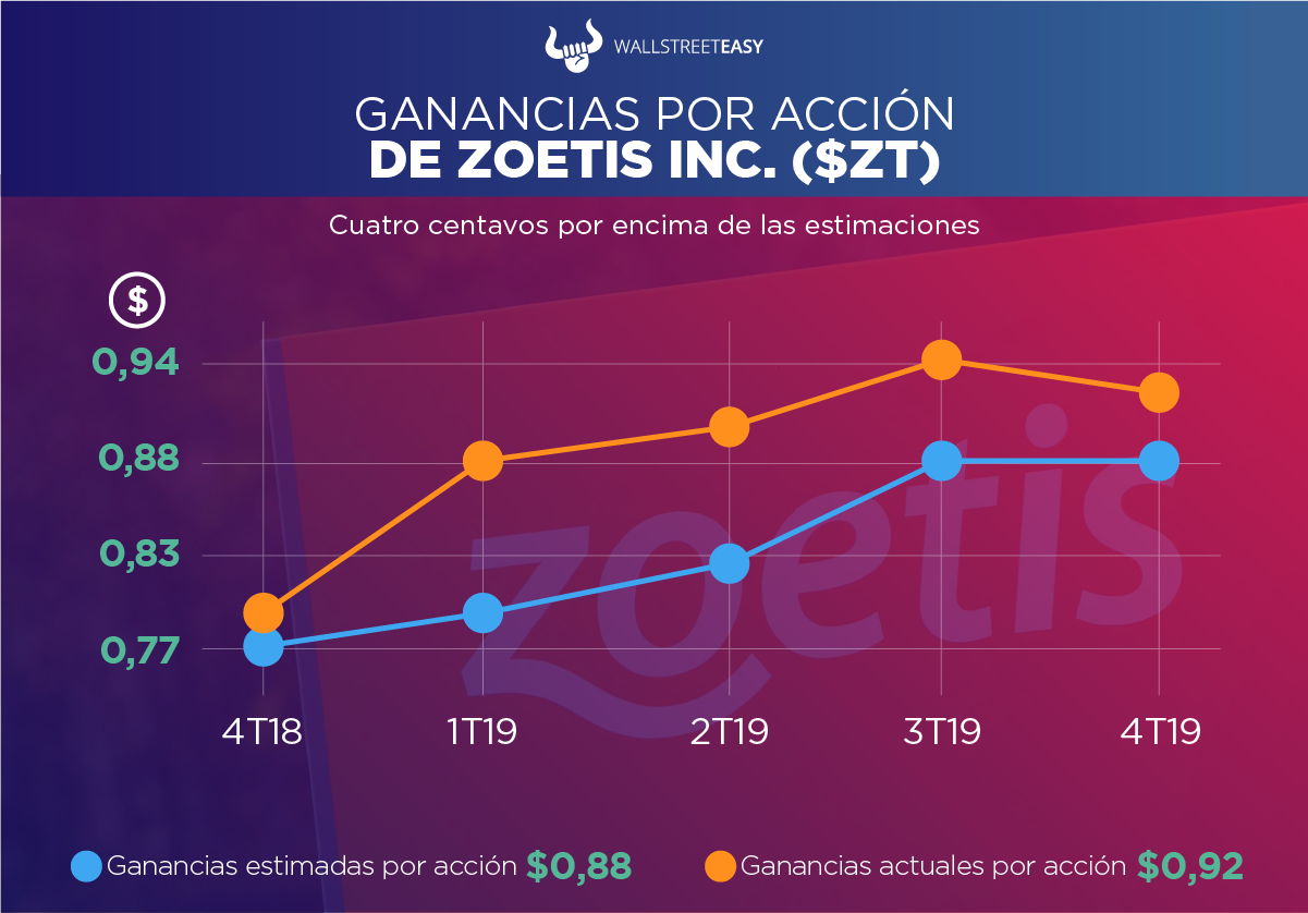 • La compañía espera ganancias ajustadas de $3,90 a $4 por acción, que está por debajo de la estimación de $3,97. Se espera que los ingresos sean de $6.650M a $6.800M, que está por encima de lo esperado de $6.690M. Las acciones de Zoetis han subido +62% en el último año contra la disminución de la industria del 0,2%.