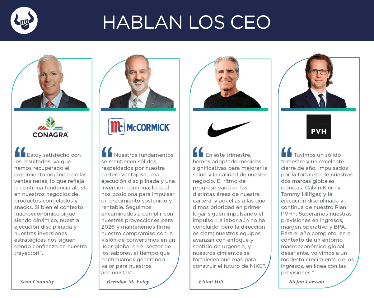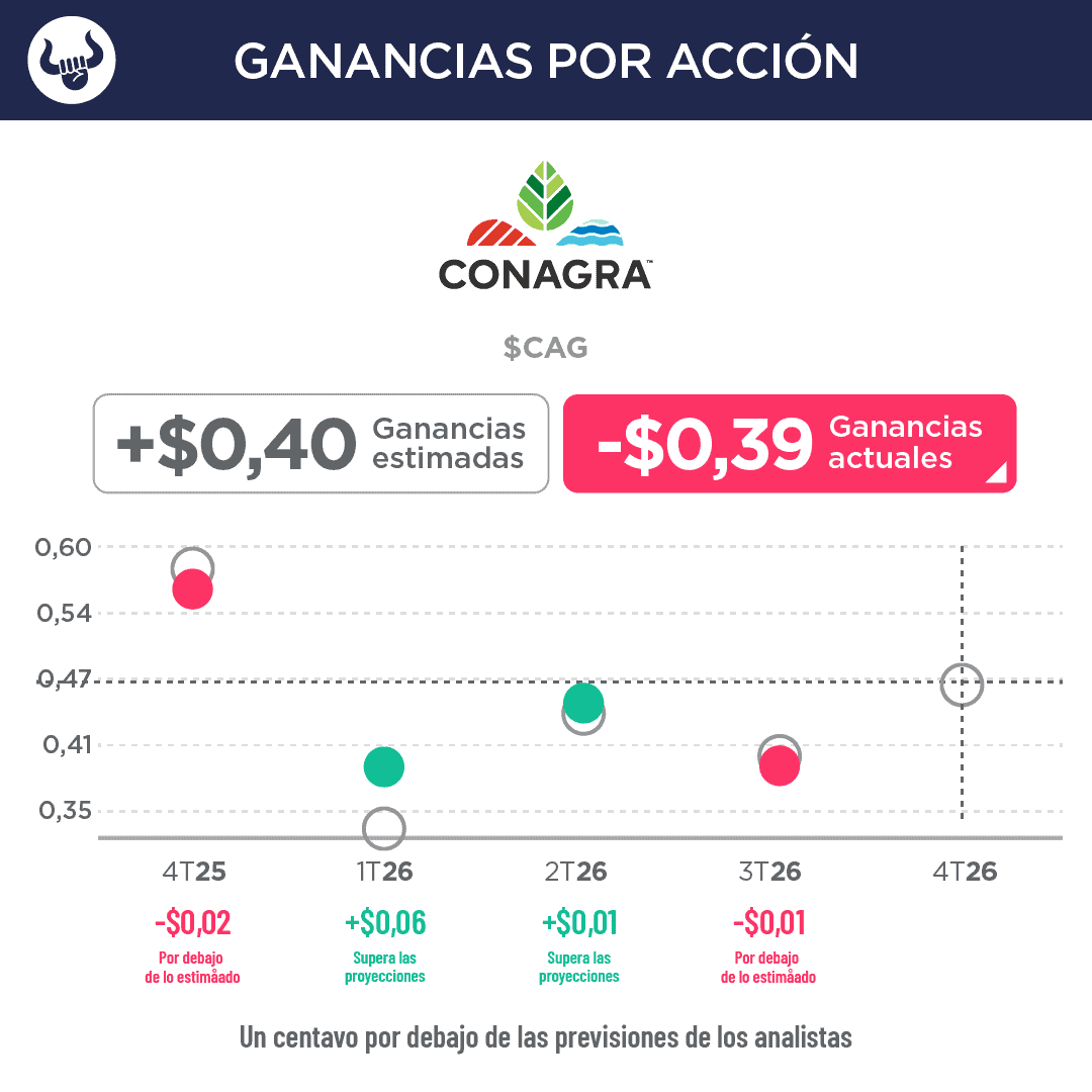 - Los resultados reflejaron una mejora en las tendencias de volumen, particularmente en las categorías de congelados y snacks, parcialmente compensadas por presiones inflacionarias, impactos de desinversiones y contracción de márgenes. Conagra redujo su guía para el año fiscal 2026.