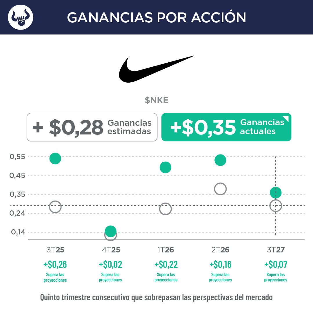 - La empresa deportiva obtuvo un beneficio por acción de 35 centavos frente a los 28 centavos esperados, e ingresos de $11.280M, por encima de la expectativa de $11.240M. El beneficio neto reportado por la compañía fue de $520M, lo que representa una caída del 35% respecto a los $794M (o 54 centavos por acción) registrados un año antes.