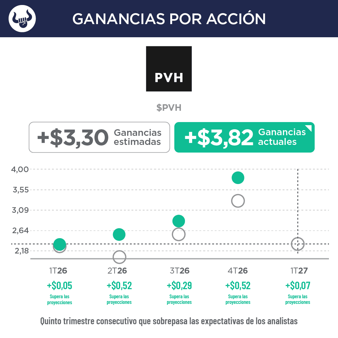 - La empresa dueña de marcas como Calvin Klein y Tommy Hilfiger reportó ganancias ajustadas de $3,82 por acción, más que los $3,27 del mismo trimestre del año anterior, y por encima de la estimación de $3,30 por acción. Los ingresos aumentaron 6% interanual a $2.505M y superaron la previsión de consenso de $2.419M.