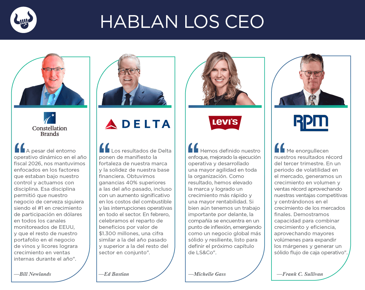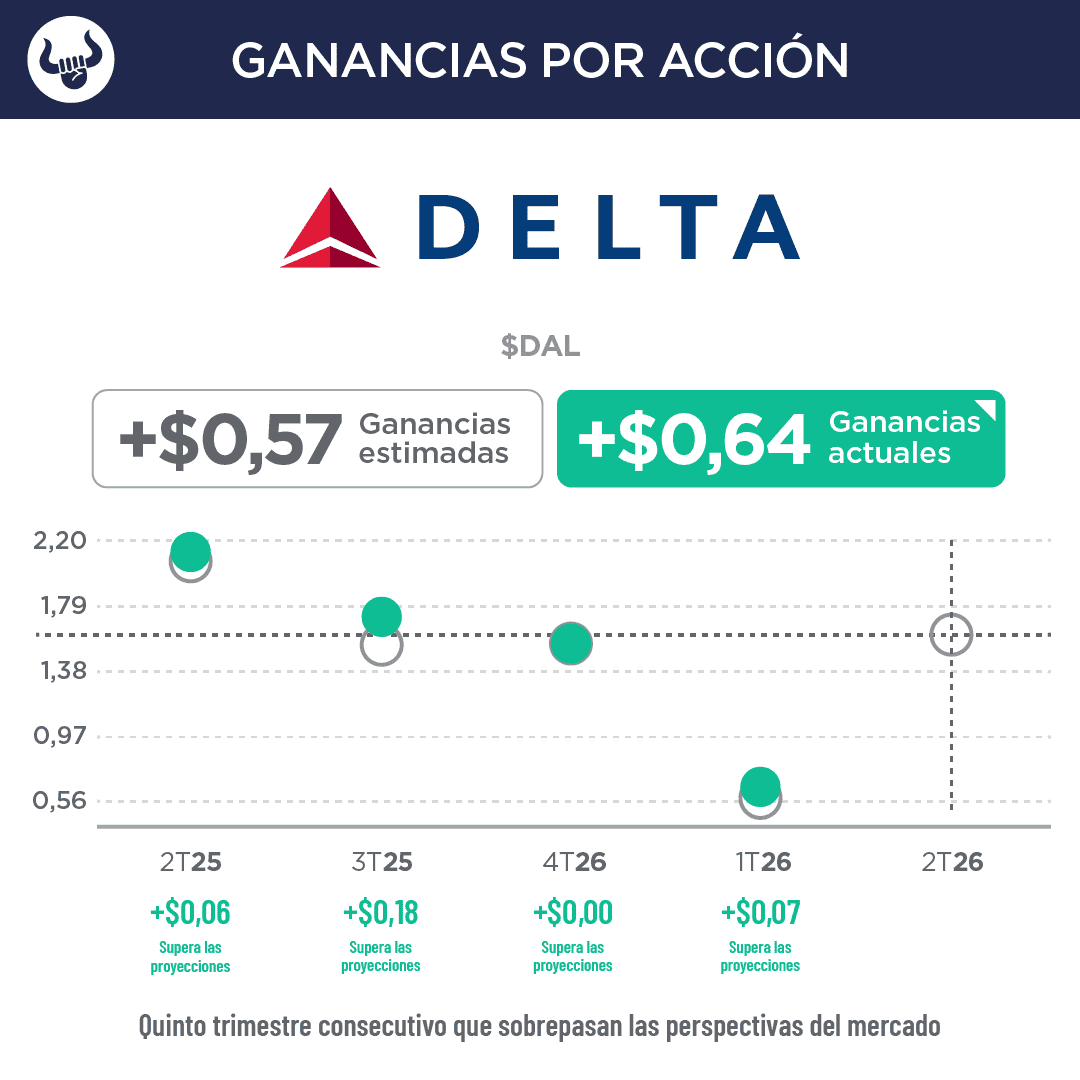 Las cuatro empresas que observamos para el reporte superan las previsiones. Delta Air Lines mostró buenos resultados, pero no dio guía trimestral por los aumentos del combustible tras la guerra de EEUU, Israel e Irán. Por su parte, Constellation Brands superó las previsiones, y aunque la venta de cerveza sigue siendo su principal ingreso, el rubro mostró una caída año tras año, mientras que Levi's tuvo un crecimiento en ventas apoyado por una subida de precios. Nos mantenemos atentos para traerles los mejores trades.