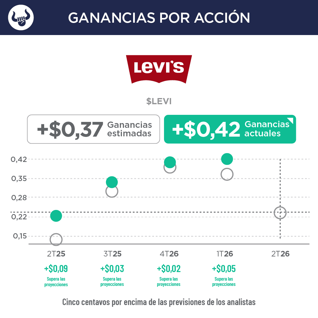 - Tras superar las expectativas, Levi's elevó sus previsiones. Ahora espera que las ganancias ajustadas por acción para todo el año se sitúen entre $1,42 y $1,48, ligeramente por debajo de las expectativas de $1,47 por acción. La compañía prevé un aumento de las ventas de entre el 5,5% y 6,5%, superando ampliamente las estimaciones del 5,6%.