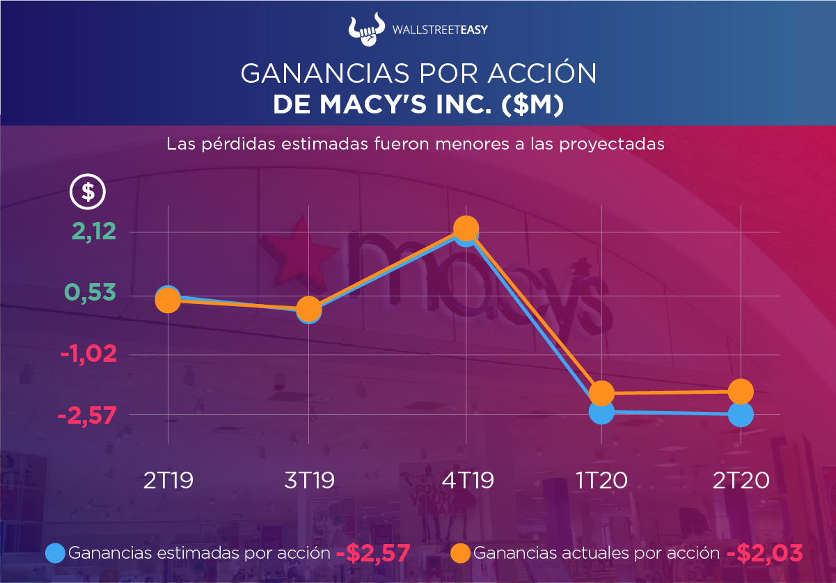 - El miércoles, Macy's reportó una pérdida del primer trimestre de $2,03 por acción, que superó la estimación de analistas de $2,57, en 21,01%, pero representa disminución del 561,36% sobre las ganancias de 44 centavos del mismo período del año pasado. La compañía reportó ventas trimestrales de $3.020M, que no alcanzaron la estimación de $3.680M. Esta es una disminución del 45,19% sobre las ventas de $5.500M en el mismo período de 2019.