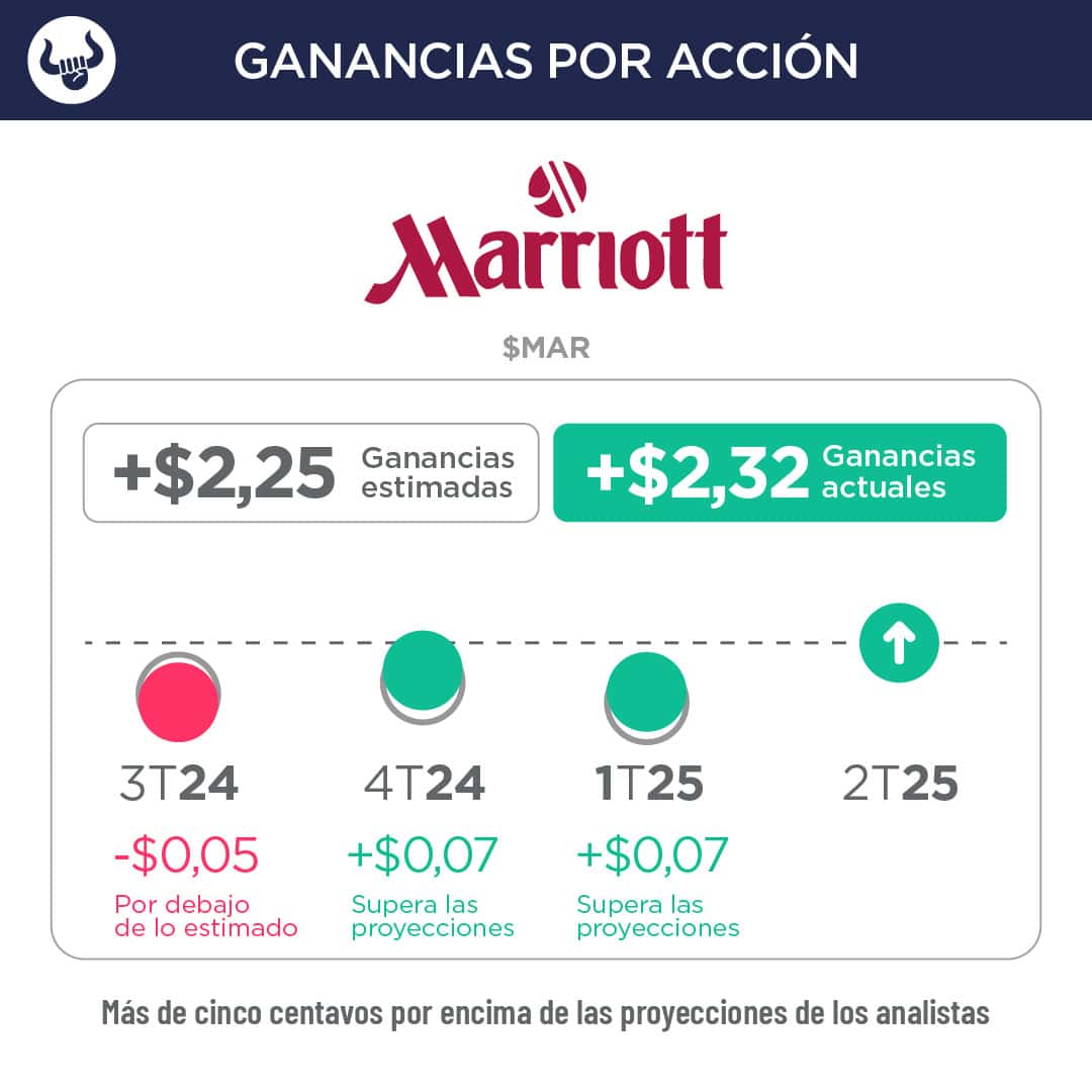 - El operador hotelero estadounidense obtuvo un beneficio ajustado de $2,32 por acción, por encima de las estimaciones de $2,25. Los ingresos aumentaron 5%, hasta $6.260M, superando las estimaciones de $6.170M.