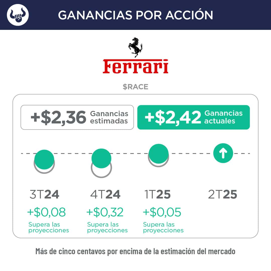 - Ferrari registró ingresos de $1.880M superando la estimación en 1,99%, y los $1.720M del año anterior, y un beneficio por acción de $2,28, por encima de la previsión de $1,89.