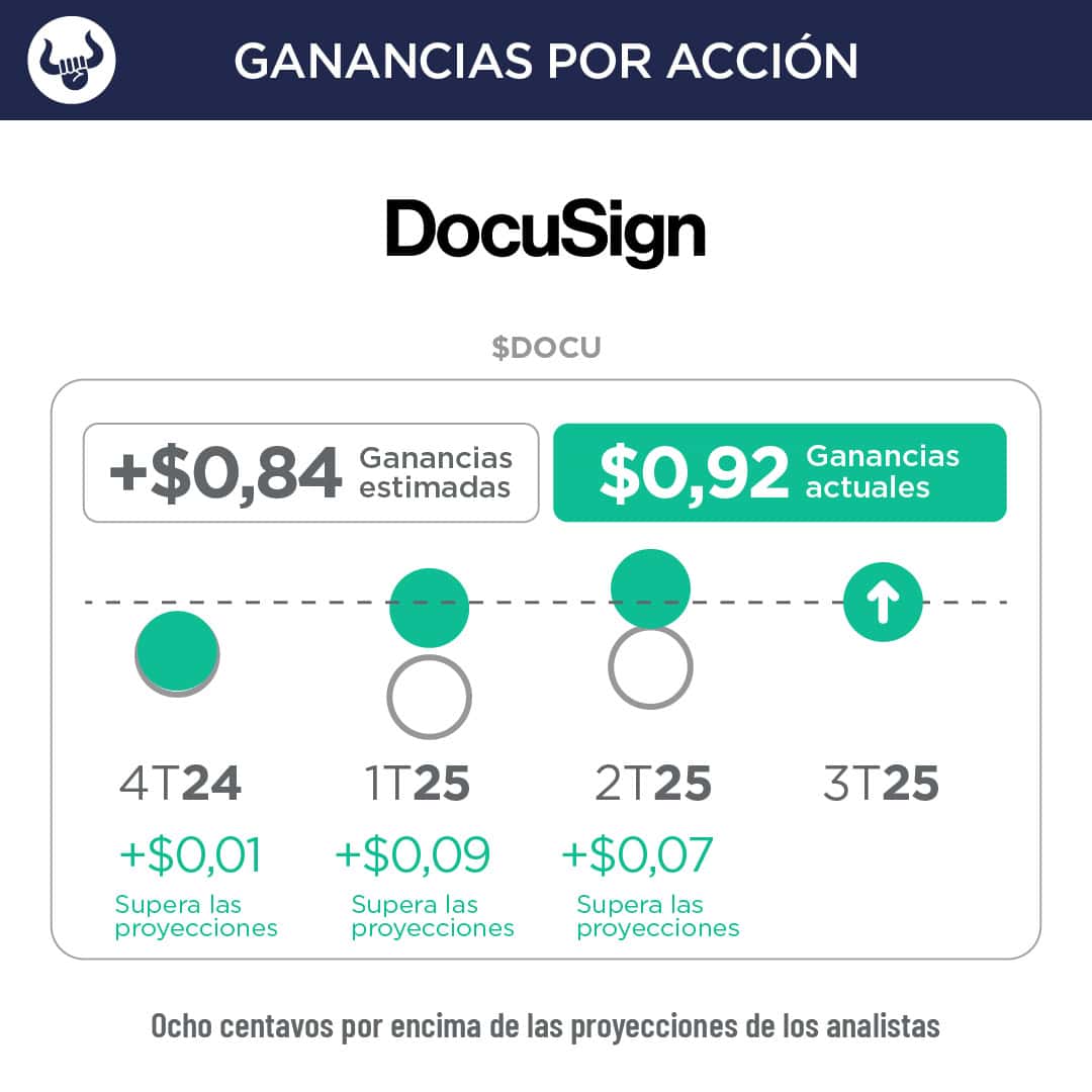 - Para el tercer trimestre actual, DocuSign espera ingresos de entre $804M y $808M y, para todo el año, ingresos de entre $3.189M y $3.201M. Los analistas esperaban unas previsiones de ingresos para todo el año de $3.160M.