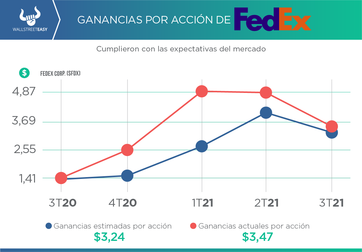- Las ganancias por acción fueron de $3,47, que supera las expectativas de $3,24. Los ingresos de $21.510M estuvieron por encima de los $19.970M estimados, y un aumento de +23% comparado con el mismo trimestre del año pasado. La compañía dijo que el aumento se debió a un “fuerte crecimiento de volumen” en su negocio de entrega doméstico y servicios de envío internacional.