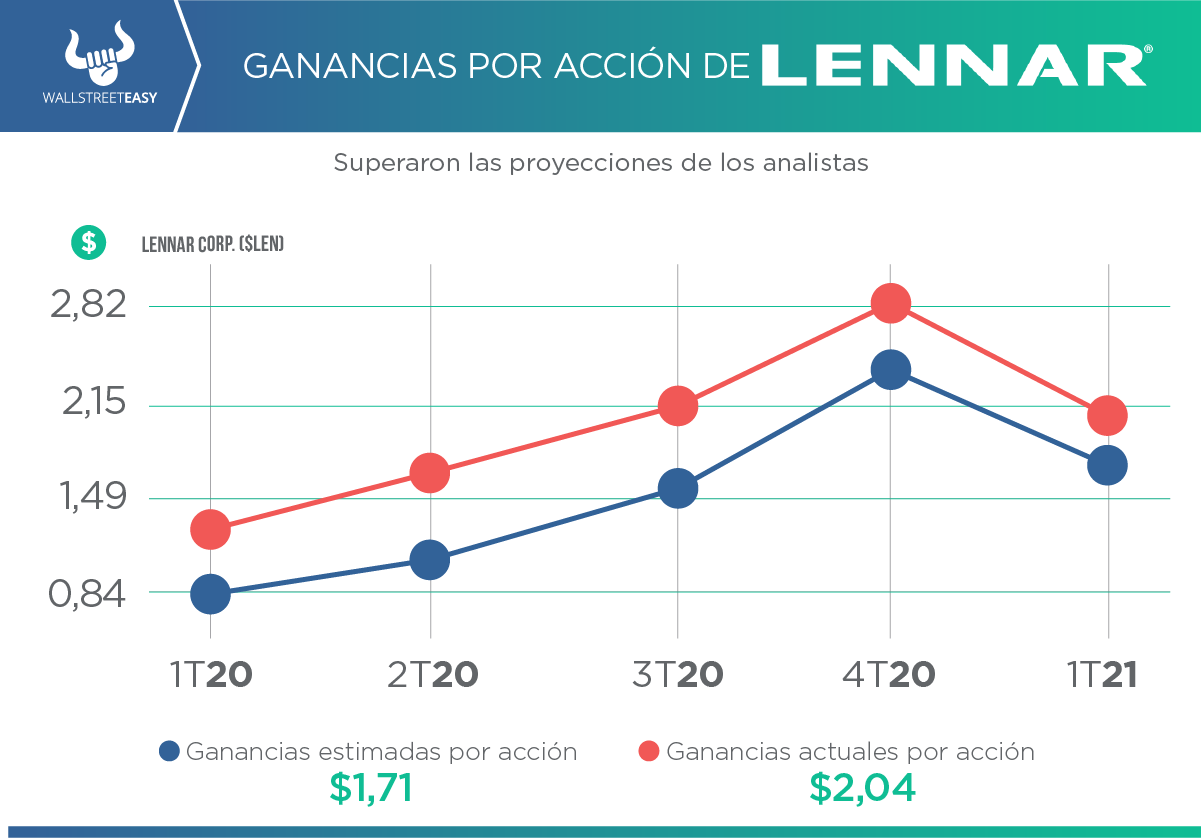 - A pesar de un repunte reciente en las tasas de interés, el CEO de Lennar, Stuart Miller dijo que «el mercado de la vivienda sigue siendo muy fuerte en todo el país». La compañía espera un margen bruto en las ventas de viviendas del 25% para el año fiscal 2021, un aumento del +22,8% en 2020 y del +20,6% en 2019, según FactSet.