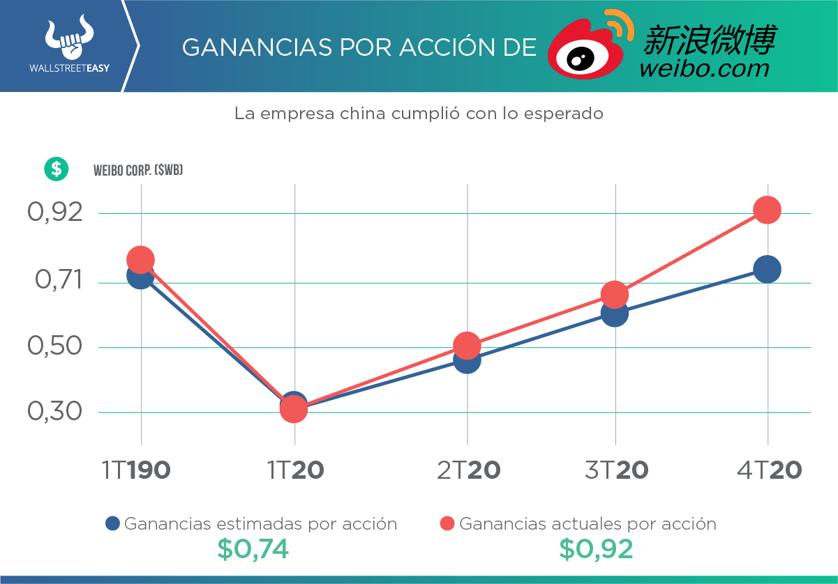- El sitio web chino de redes sociales informó un ingreso neto por acción de $0,92, en comparación con $0,77 el año pasado. En promedio, el mercado esperaba que la compañía reportara ganancias por acción de $0,74.