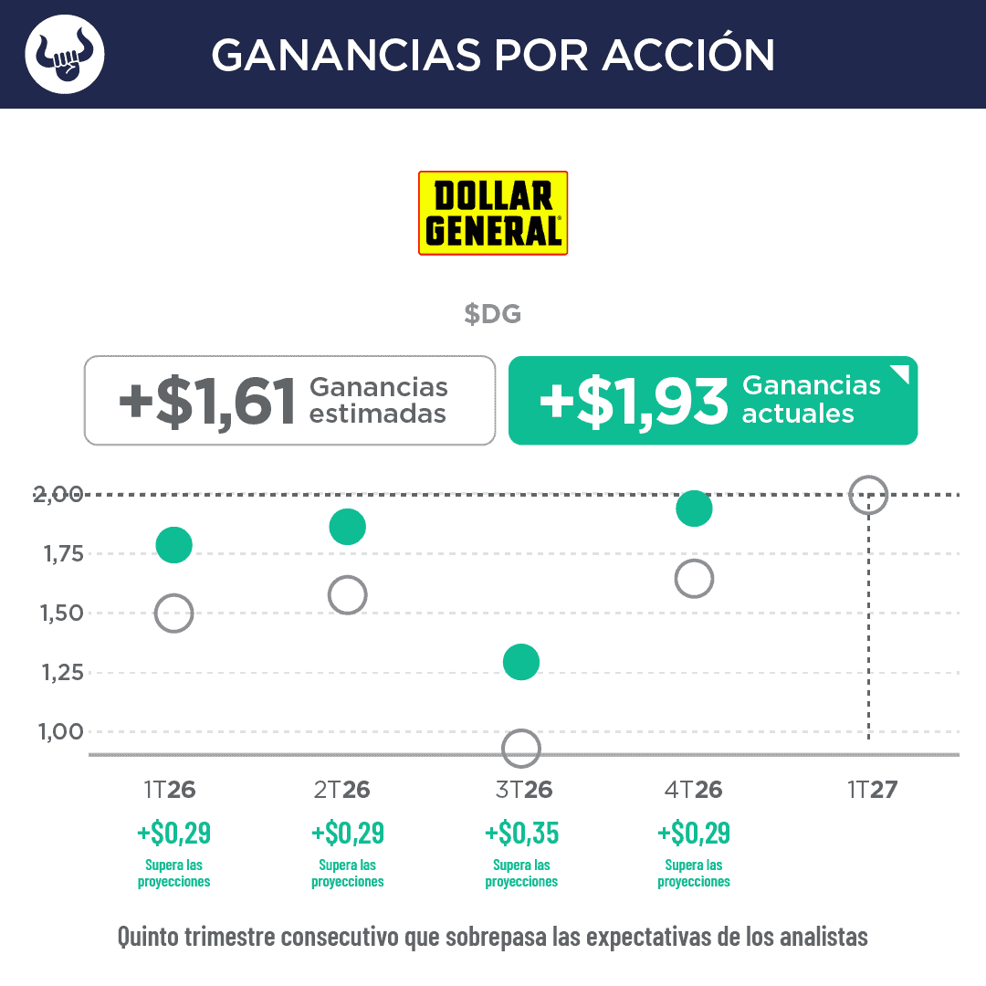 - La cadena de tiendas de descuento reportó ganancias fiscales de $426,3M, y ganancias de $1,93 por acción ($0,87 del mismo período del año anterior), que superaron la previsión de $1,61 por acción, e ingresos de $10.910M, por encima de los $10.780M esperados.