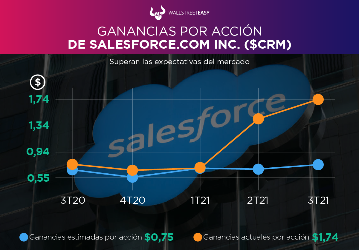 - Las ganancias por acción fueron de $1,74, que superan los 75 centavos esperados por los analistas. Los ingresos de $5.420M, también estuvieron por encima de las expectativas del mercado de $5.250M. Además, anunció su intención de adquirir la aplicación de comunicación laboral Slack por un valor de $27.700M.