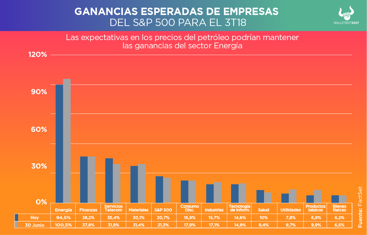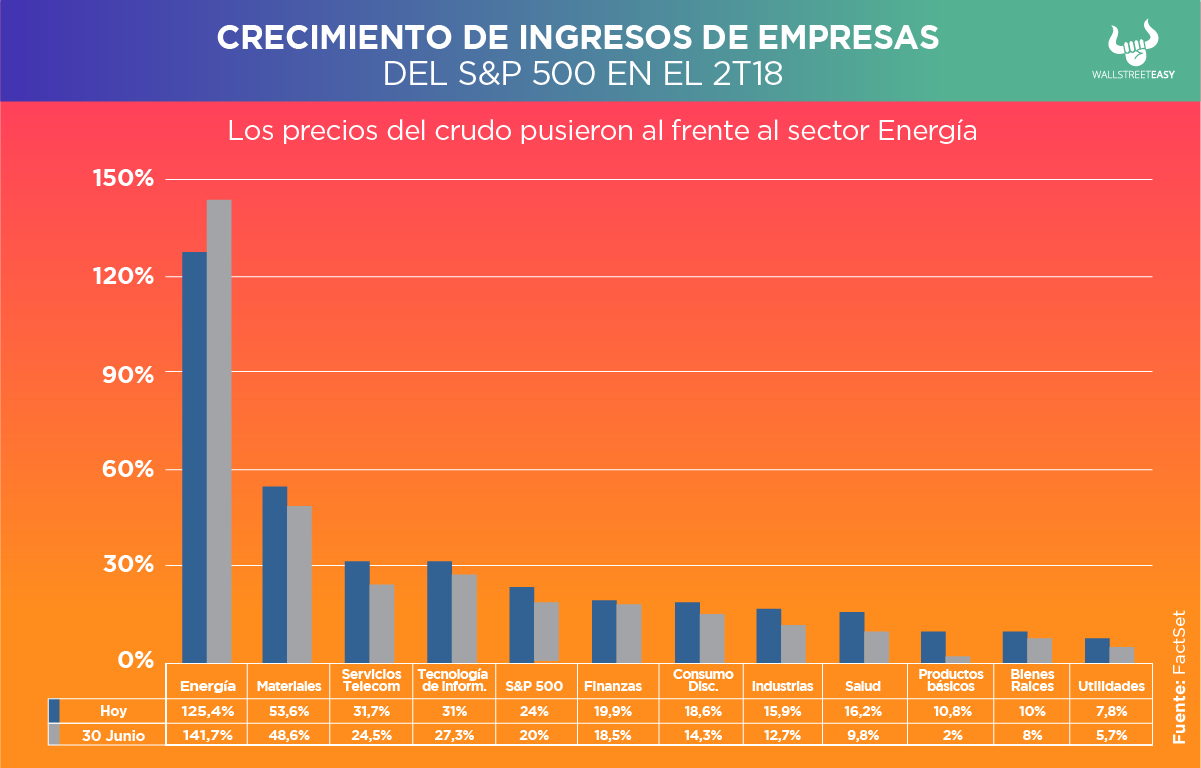- Energía: Reporta el mayor crecimiento de ganancias (año tras año) de los once sectores en +125,4%. La tasa de crecimiento inusualmente alta para el sector se debe al aumento en los precios del petróleo. En el 2T18 las ganancias fueron $18.300M, en comparación con los $8.100M del 2T17 y tuvo los ingresos más bajos en el trimestre del año anterior de los once sectores.