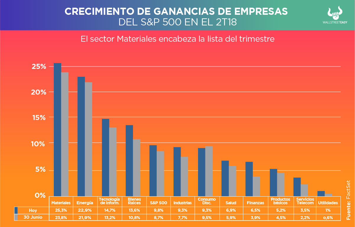 - Materiales: Es el de segundo mayor crecimiento con +53,6%. Sus cuatro industrias están reportando crecimiento de ganancias de dos dígitos: Metales y Minería (+102%), Productos Químicos (+48%), Empaques y Contenedores (+47%) y Materiales de construcción (+41%). DowDuPont es el mayor contribuyente al crecimiento de las ganancias para el sector.