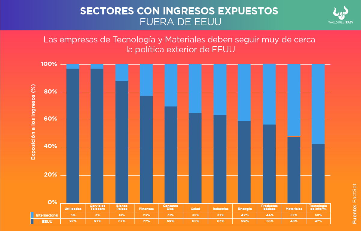 Como se muestra en el siguiente gráfico, algunos sectores tienen una fuente importante de ingresos que proviene del exterior, por lo que una guerra comercial puede incidir sobre el rendimiento de algunos de ellos.