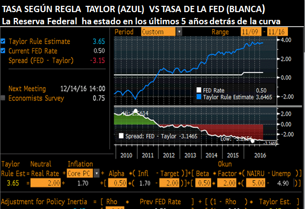 La tasa de interés, según la Regla Taylor, ha seguido en aumento durante 2016, mientras la FED ha atrasado la continuación de las subidas.