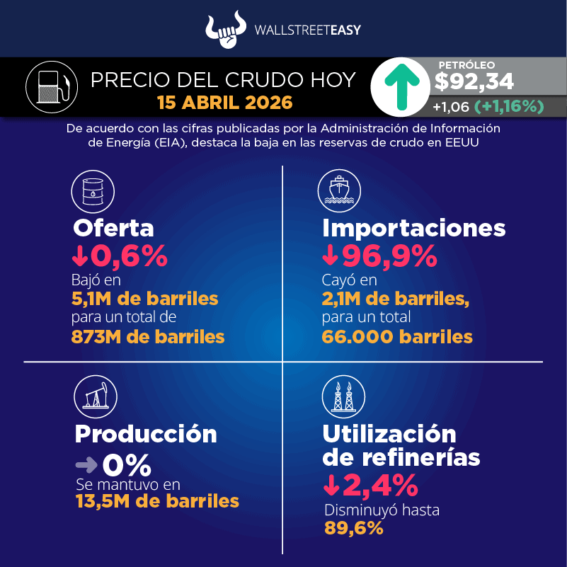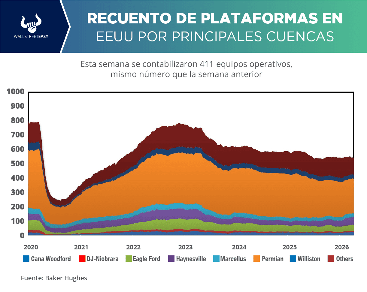 ¿ALGUNA NOVEDAD GEOPOLÍTICA? La drástica revisión a la baja del crecimiento de la demanda mundial para 2026 por parte de la IEA y la tensa tregua en la confrontación entre EEUU e Irán han provocado una caída en los precios del petróleo esta semana, con el ICE Brent cotizando varios dólares por debajo de los $100 por barril. A menos que el bloqueo estadounidense del Mar Arábigo se intensifique en los próximos días, la segunda ronda de conversaciones en Islamabad determinará la evolución de la curva de futuros del crudo. ¿OTRO ACONTECIMIENTO? Según la Agencia Internacional de Energía (IEA), la demanda mundial de petróleo se contraerá este año en 80.000 bpd, la primera disminución anual del consumo desde el pico de 2020 debido a la COVID-19, y representa una caída de más de 700.000 bpd con respecto a la previsión del mes pasado. ¿OTRA NOVEDAD? La petrolera estatal Saudi Aramco ha recibido el menor volumen de nominaciones mensuales de compradores chinos a largo plazo de la historia, con solo 18M de barriles de petróleo con destino a China que se espera cargar en mayo, una caída de 750.000 bpd con respecto a abril. ¿ALGO MÁS? Las importaciones chinas de crudo promediaron 11,77M bpd en marzo, solo 2,8% menos que el año anterior, a pesar de la pérdida de la mayor parte del suministro de Medio Oriente, incluso con tasas de utilización de refinerías inferiores al 70%. PARA NO PERDER DE VISTA Chevron aumentará su participación en el proyecto Petroindependencia de Venezuela del 34% al 49%, y también adquirirá una participación no especificada en la recién formada empresa conjunta Ayacucho con PDVSA, lo que mejora sus perspectivas en el país. POR ÚLTIMO La semana pasada, los inversores apenas modificaron su perspectiva extremadamente optimista sobre el Brent, en medio de una desaceleración en las operaciones durante la Semana Santa y señales contradictorias sobre el rumbo de la guerra entre EEUU e Irán. Los fondos de cobertura y otros gestores de fondos vendieron el equivalente a 5M de barriles de futuros y opciones de Brent durante los siete días que finalizaron el 7 de abril. CUÉNTAME SOBRE LAS PLATAFORMAS PETROLERAS EN EEUU De acuerdo con información de Baker Hughes, actualmente en EEUU se encuentran 545 equipos activos (incluyendo los de gas). En la actividad petrolera se contabilizaron 411, mismo número que la semana anterior. En las operaciones de gas hay 127 equipos operativos, tres menos que hace siete días. Hace un año estaban activas 583 plataformas.