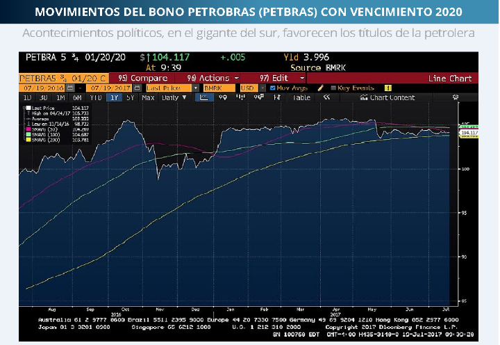 Si vemos a continuación la gráfica, veremos el desempeño del papel petrolero brasileño. Las nuevas emisiones para pagar deuda y la continuación de los proyectos, sumado a los últimos acontecimientos políticos, despiertan el interés por ese mercado.