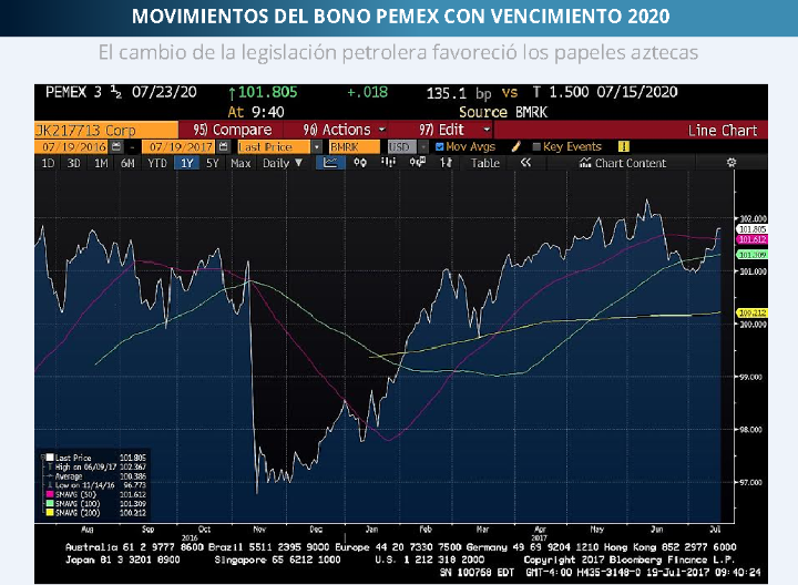 En la gráfica siguiente podemos observar el título mexicano con un buen precio. Al ratificar que los recursos de nuevas emisiones se utilizarán para proyectos de inversión y operación de refinanciamiento, a los inversionistas se les abrió el apetito.