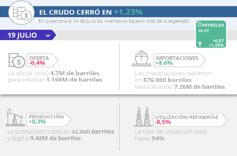 La Administración de Información de Energía (EIA, por sus siglas en inglés) reportó una caída de los inventarios de 4.7M en la semana al 14 de julio. El consenso esperaba una merma de 3.2M. Otros datos del informe: