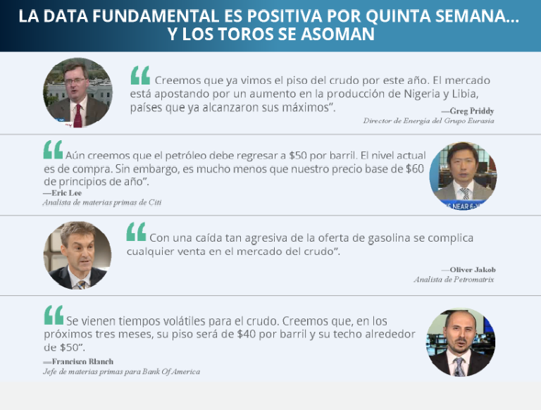 Data fundamental sigue en mejoría por quinta semana consecutiva, pero el petróleo avanza poco debido al sentimiento negativo del mercado. Posicionamiento negativo de fondos de inversión sigue afectando el crudo. Nuevo rango del precio es de $44-$50.