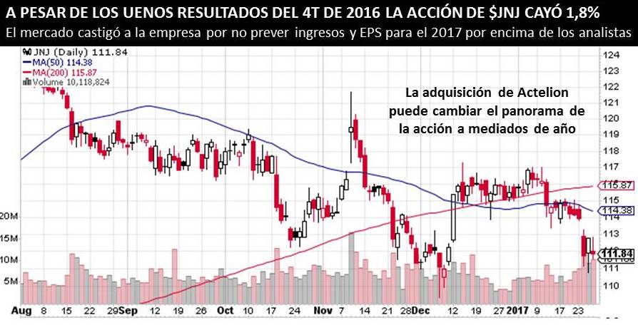 Johnson & Johnson cerró con buenos números el 2016 . Bajas expectativas para el 2017 provocaron caída de -1,8%. La adquisición de Actelion mejorará el panorama de $JNJ